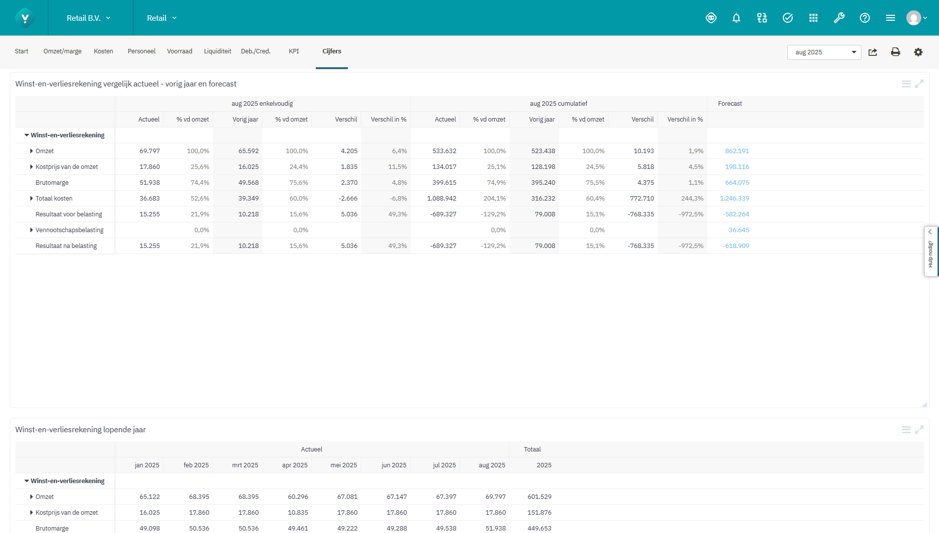 - Inzicht in diverse omzet-, resultaat-, kosten- en marge-KPI’s per rapportageperiode.