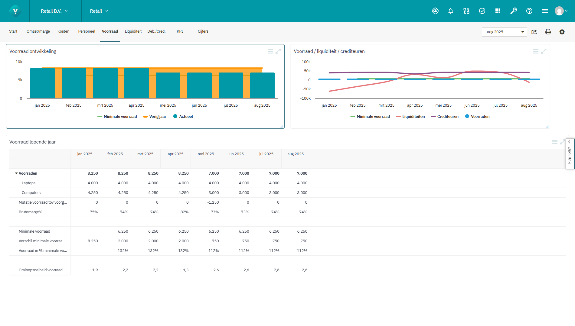 - Cijfermatige weergave van het verloop van de voorraad, mutatie voorraad en verschil minimale voorraad.